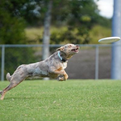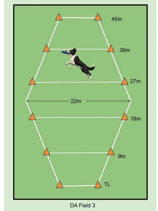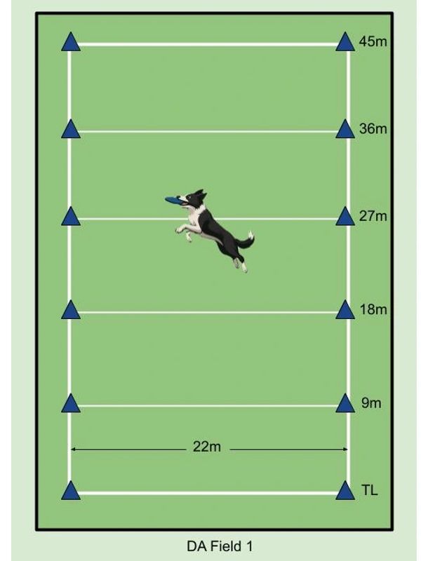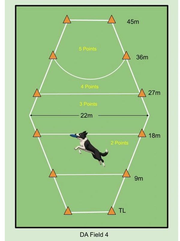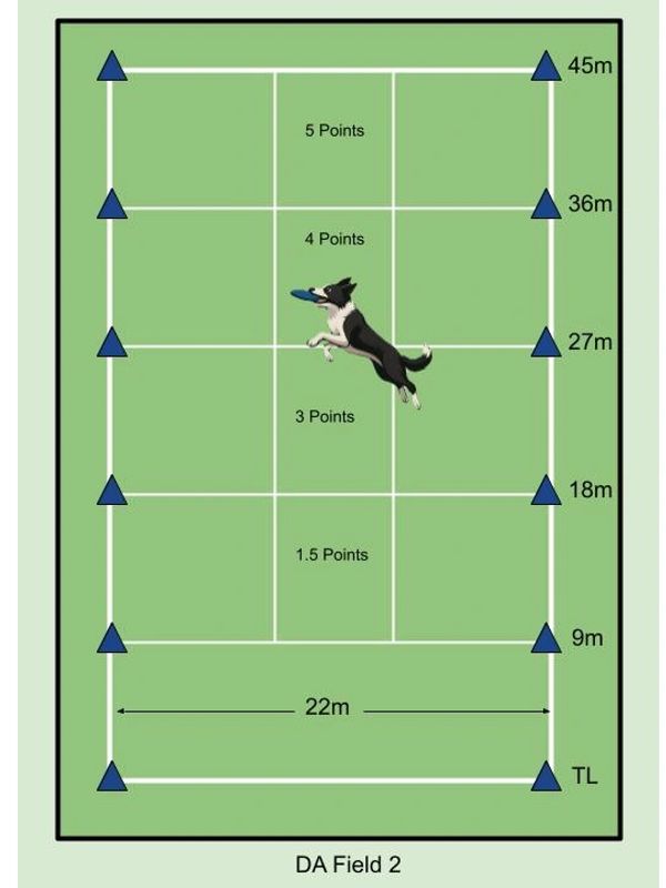Dogs catch discs in marked zones across the field – the farther the catch, the higher the score! Bonus points are awarded for airborne catches.